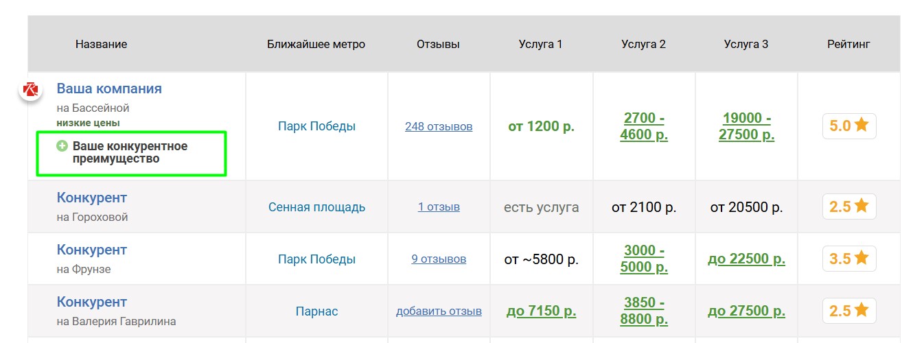 Если компания имеет конкурентные преимущества, мы можем их опубликовать на странице квеста и показывать в таблицах в соответствующих страницах. Преимущества можно гибко настраивать для разных услуг. Правильная публикация преимуществ существенно увеличивает интерес посетителей, так как выделяет квест в таблицах и показывает, почему следует обратиться именно туда.